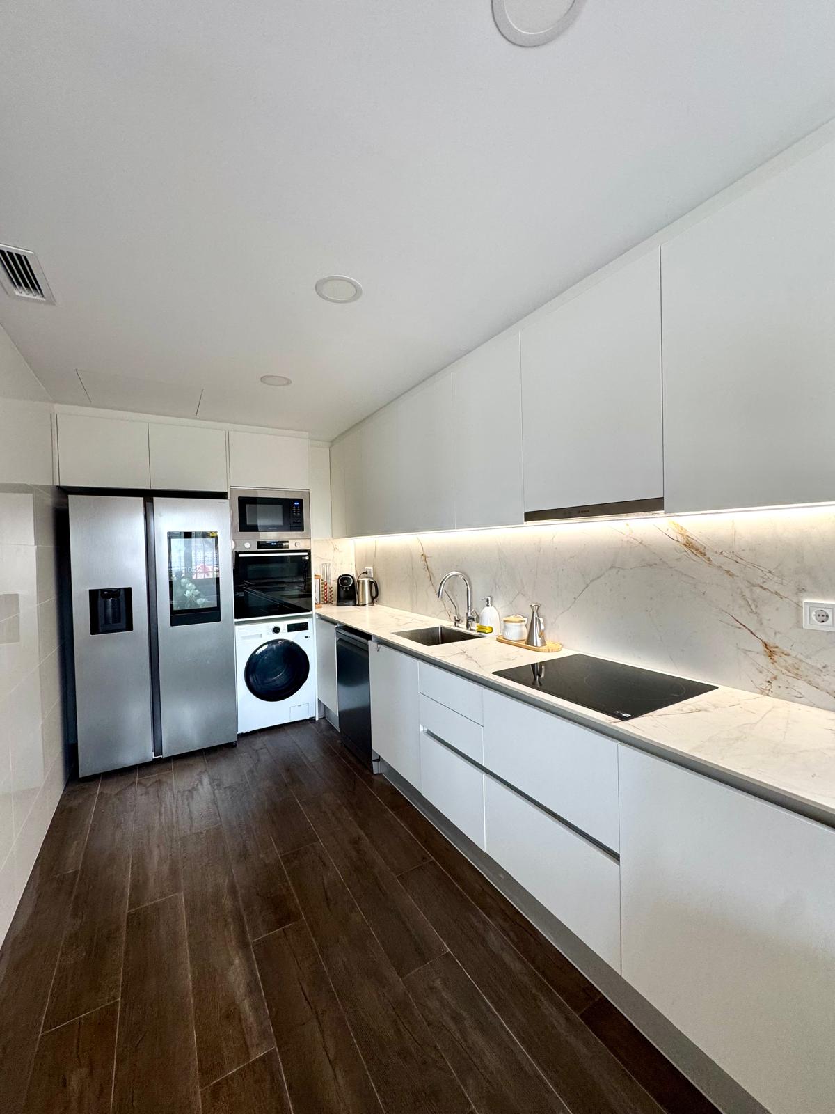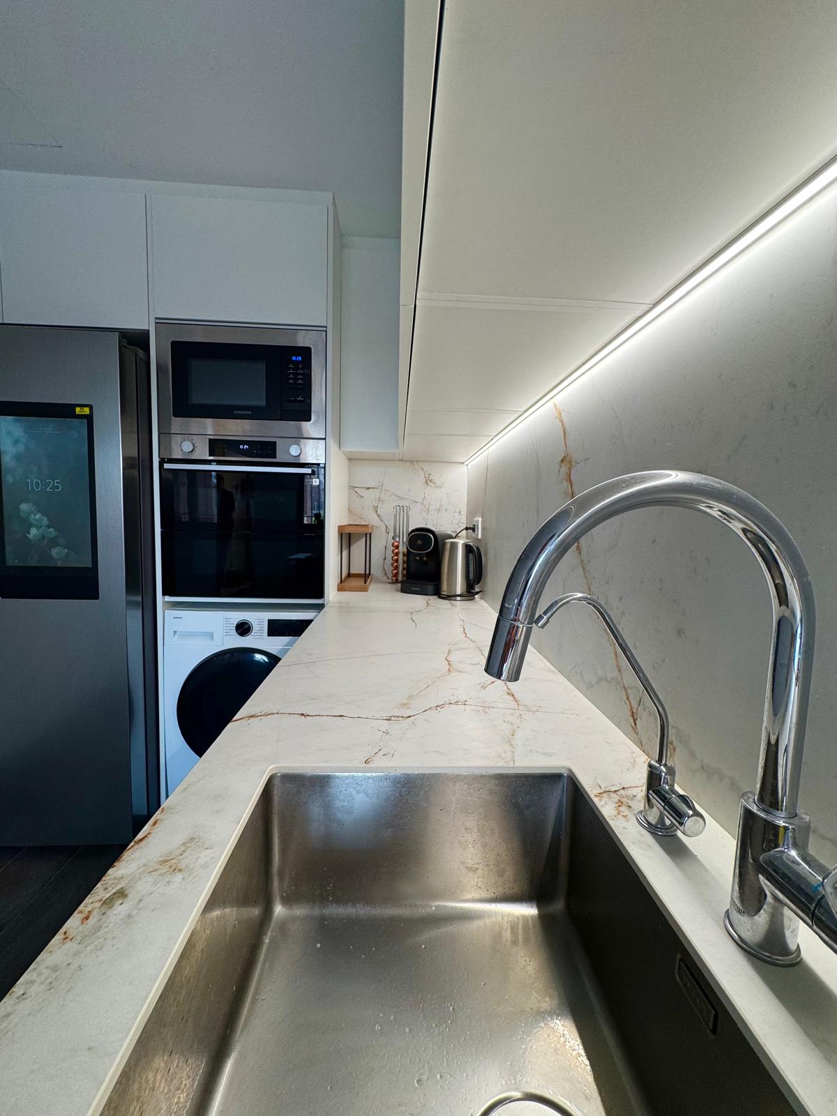 Para responder a estos objetivos, rediseñamos completamente la distribución, apostando por una cocina lineal que optimiza el paso y facilita el trabajo en el día a día. Se priorizó la integración de los electrodomésticos y el uso de módulos de almacenaje funcionales, manteniendo todo organizado y accesible. La eliminación de elementos visualmente pesados, como muebles altos con tiradores, permitió aligerar el conjunto. El trabajo se completó con una renovación total de las instalaciones eléctricas y de fontanería, asegurando máxima eficiencia y seguridad.