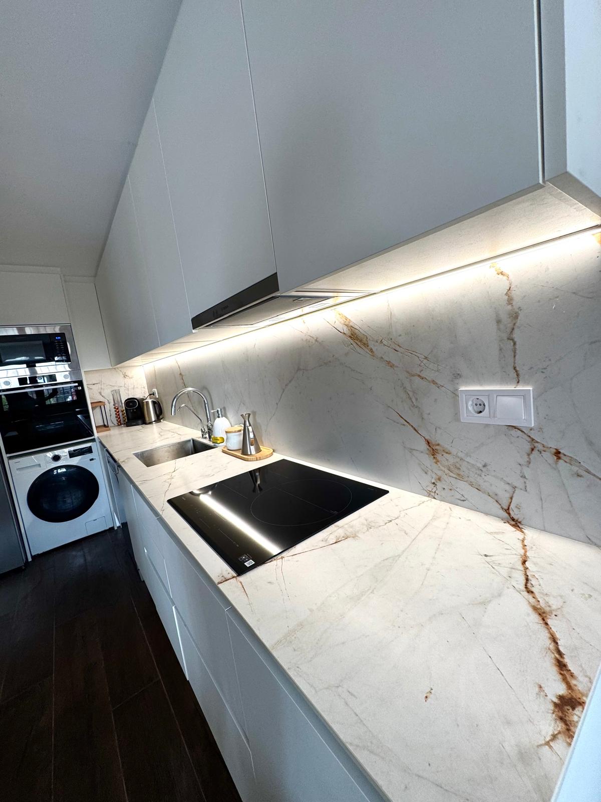 Para la renovación se optó por una gama de materiales que combinan resistencia, elegancia y bajo mantenimiento. El mobiliario en blanco mate sin tiradores genera una estética minimalista y facilita la limpieza diaria. La encimera y el frente de trabajo en porcelánico efecto mármol ofrecen una superficie robusta y refinada, ideal para un uso intensivo. En el suelo, se colocó porcelánico imitación madera en tonos cálidos, lo que aporta calidez sin sacrificar la durabilidad. La grifería y los electrodomésticos en inox aportan un contraste elegante y contemporáneo que realza todo el conjunto.