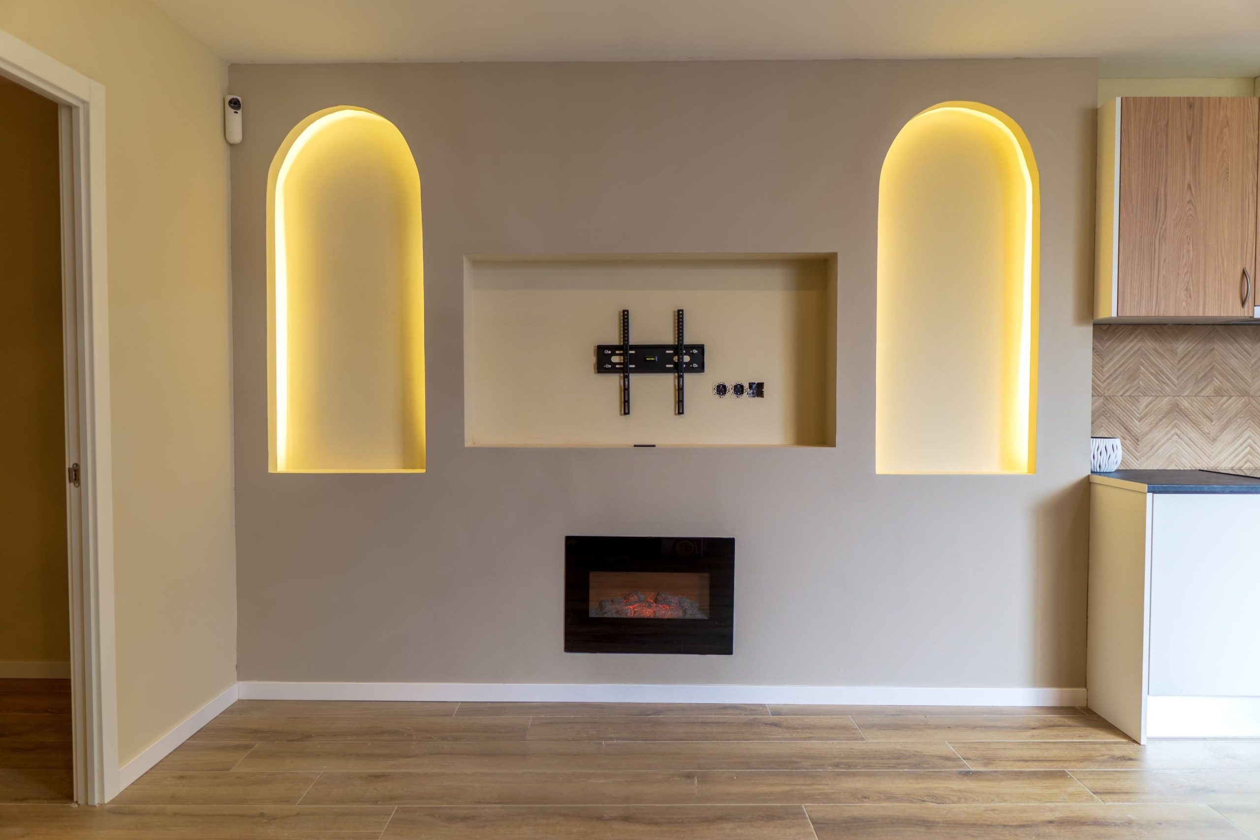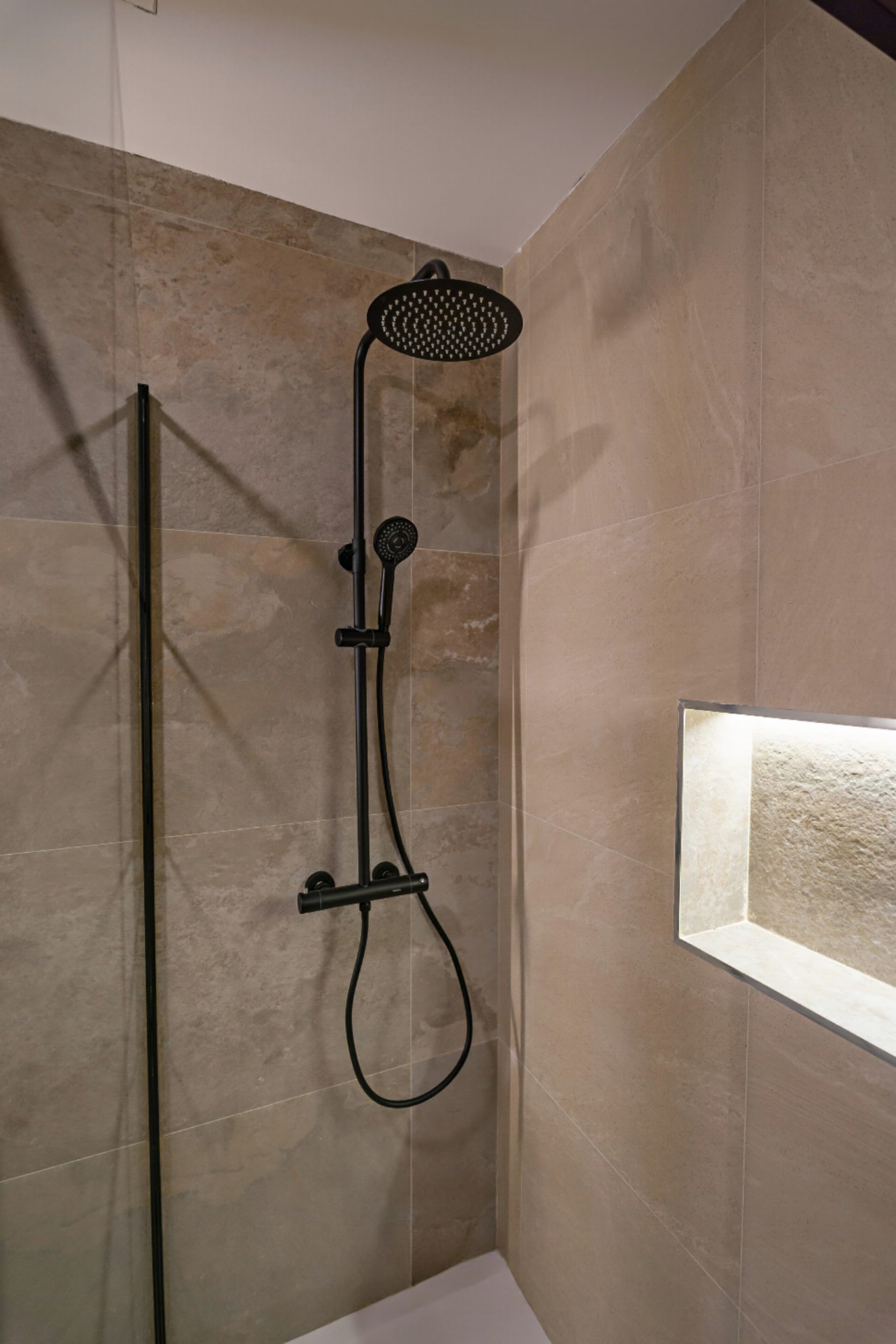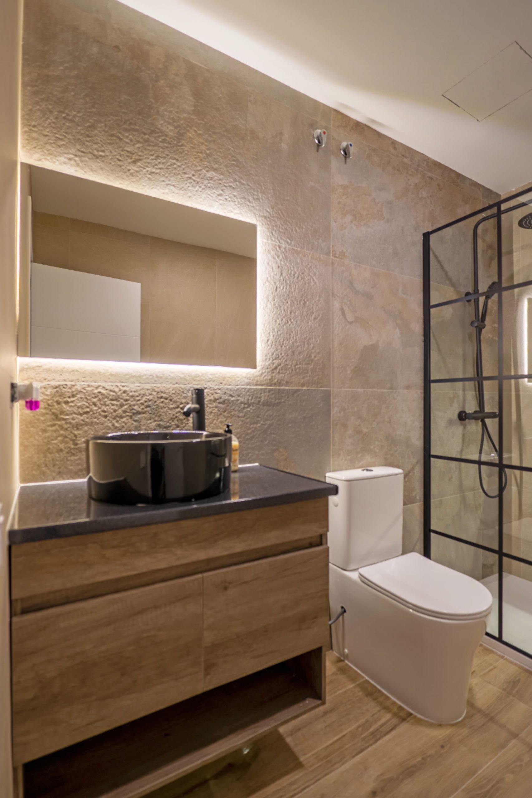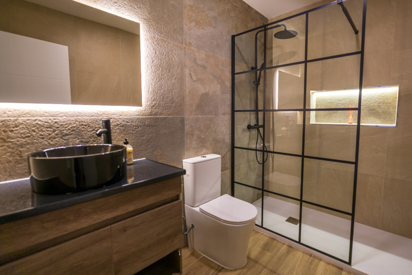 En el baño se apostó por un diseño moderno y elegante, con una ducha de obra con mampara de hierro y cristal, grifería en negro y un lavabo sobreencimera que aporta personalidad al conjunto. La iluminación indirecta juega un papel clave en toda la vivienda, especialmente en las hornacinas decorativas del salón, que aportan carácter y un punto de diseño diferenciador.