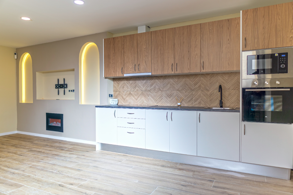 Elegimos materiales que combinan resistencia, estética y calidez. El suelo de toda la vivienda simula madera, aportando continuidad y sensación de confort. En el baño, los revestimientos cerámicos en tonos tierra con texturas combinadas crean un ambiente sofisticado y natural. La cocina mezcla acabados en blanco y madera natural, con detalles en negro que armonizan con el resto de la vivienda.