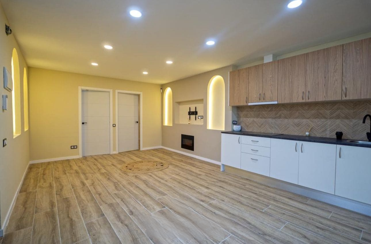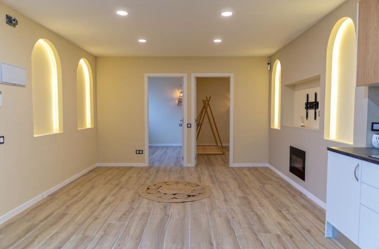 El reto principal era claro: convertir un local comercial sin uso en una vivienda completa y cómoda. El espacio era amplio pero sin distribución ni acabados habitables. El objetivo fue crear una vivienda con tres habitaciones, baño moderno, cocina abierta al salón y buena iluminación, todo dentro de los requisitos de habitabilidad actuales.