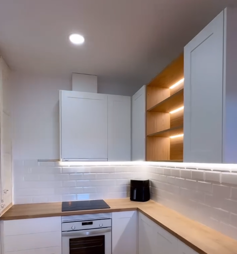 Para los muebles de cocina se eligieron frentes blancos mate con tiradores ocultos, aportando un diseño limpio y actual. Las encimeras de madera natural y los estantes abiertos aportan textura y calidez, generando un contraste armónico con el blanco predominante.