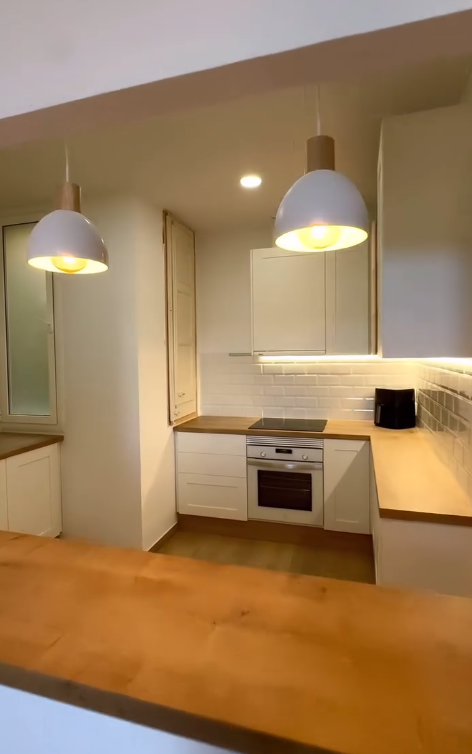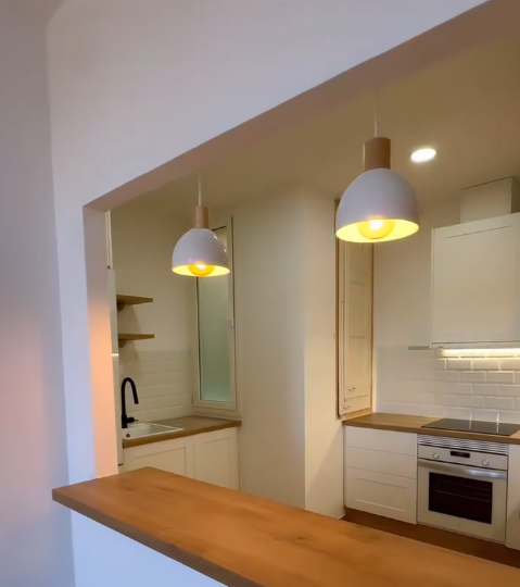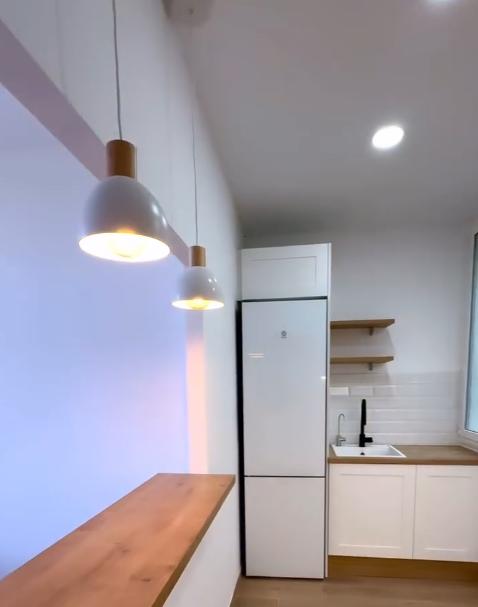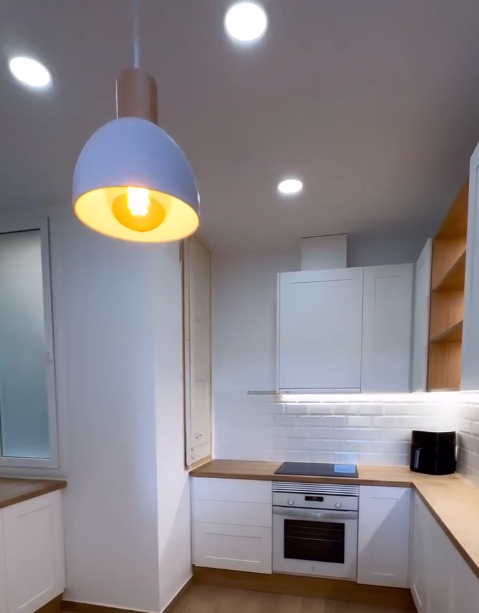 Además, instalamos iluminación técnica (focos empotrados) combinada con lámparas colgantes decorativas, creando diferentes ambientes según el uso: práctico y directo para cocinar, cálido y relajado para comer o conversar.